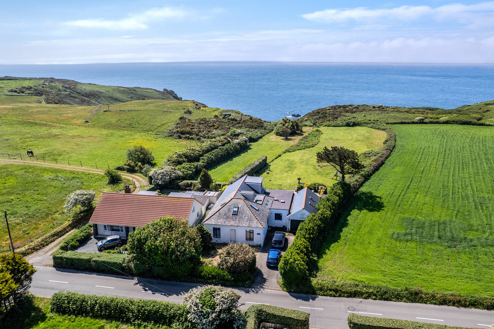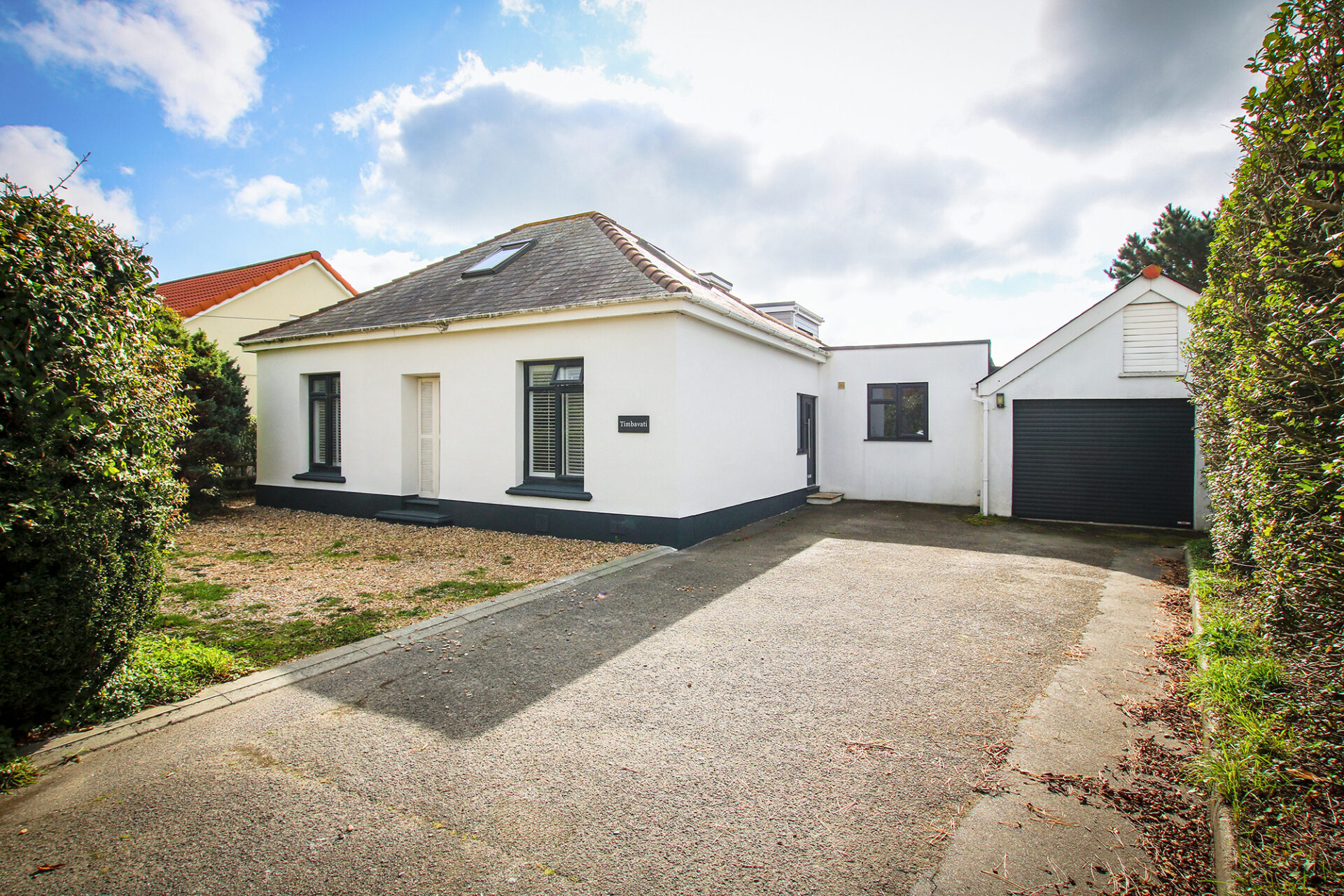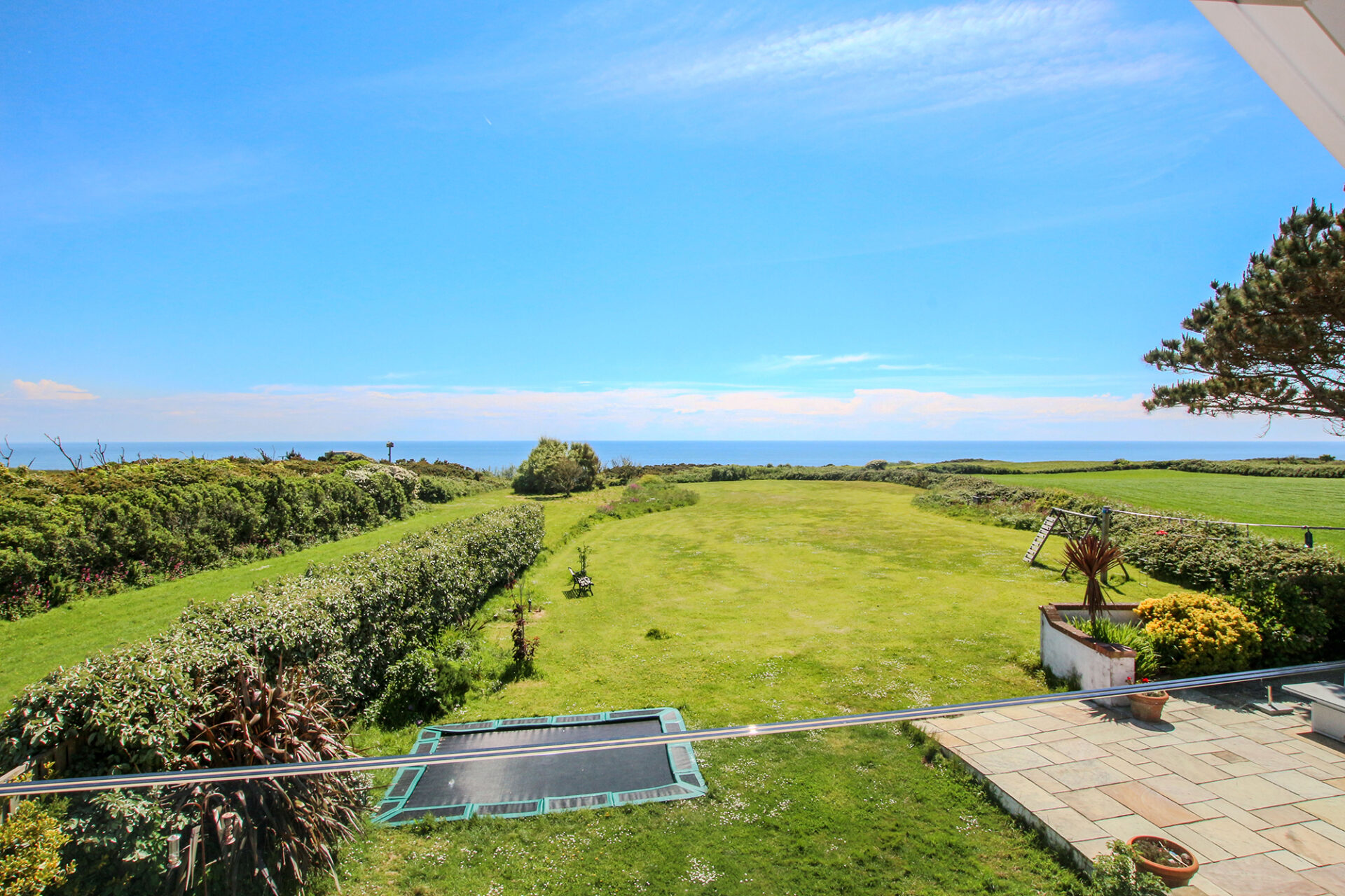 Externally, a garage and ample parking are positioned to the front and to the rear, an expanse of lawned garden boasting uninterrupted sea views.