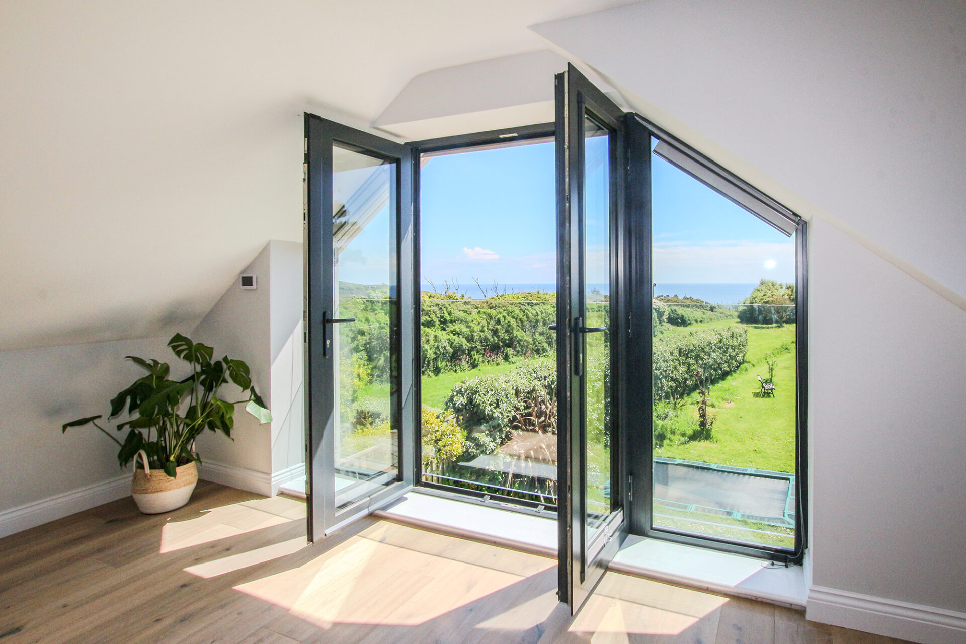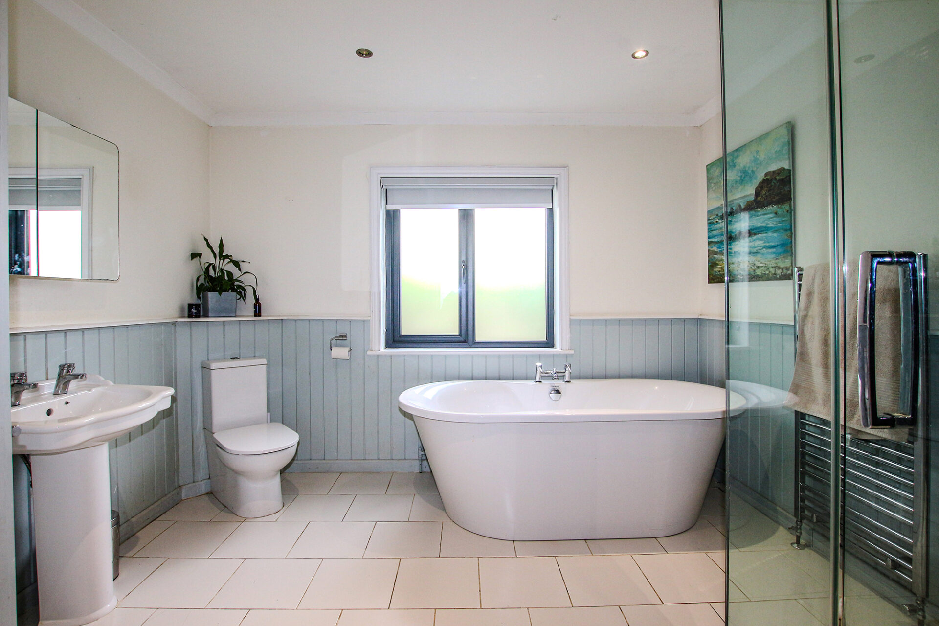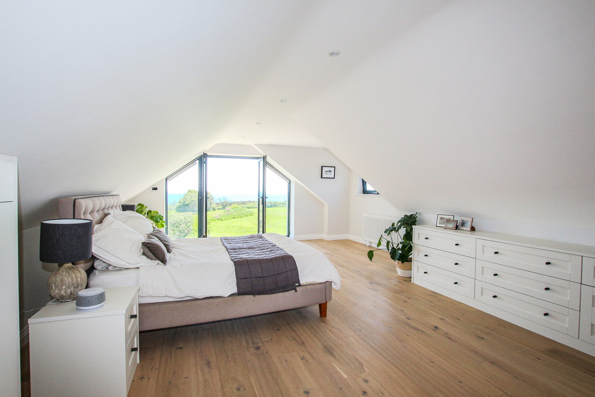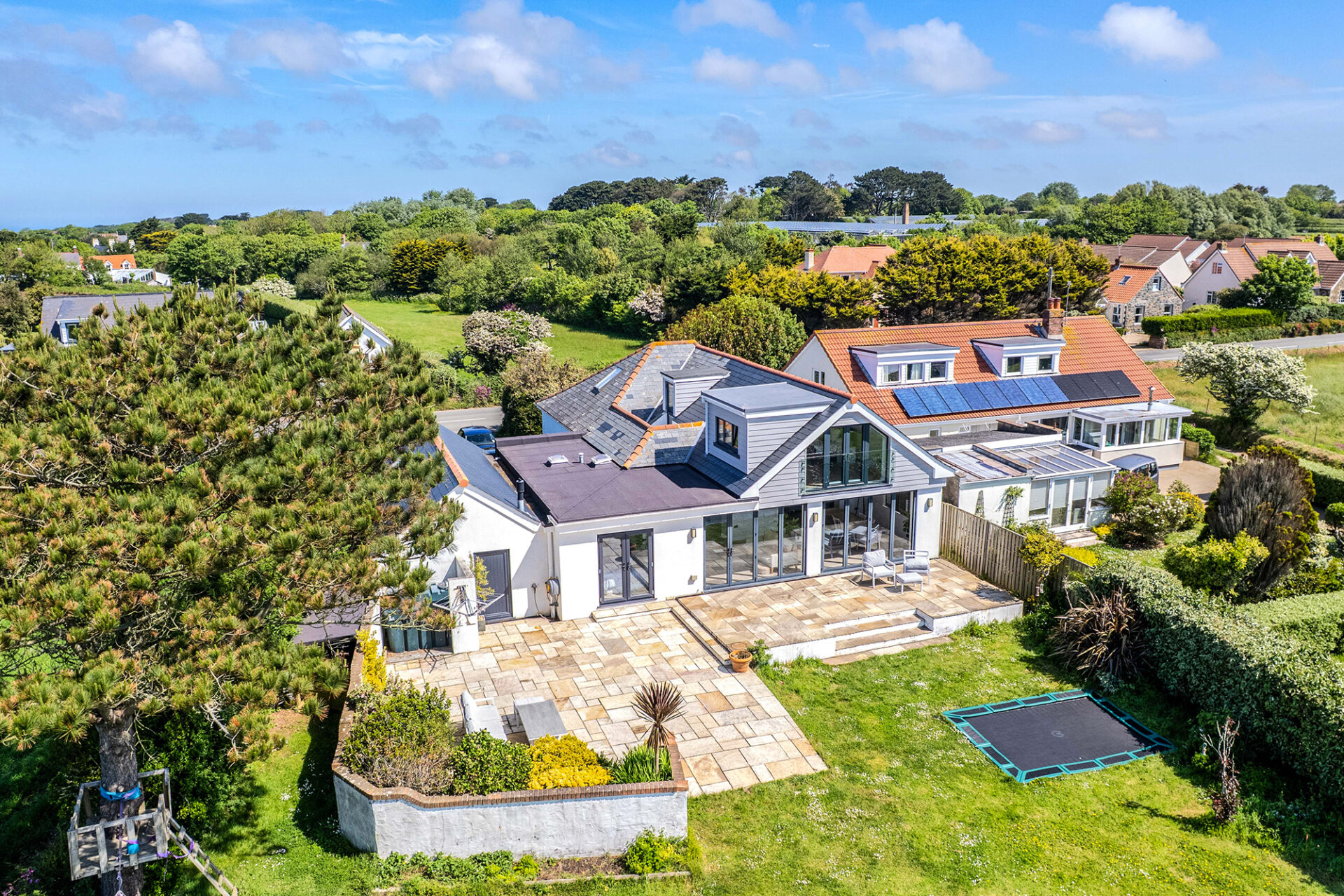 Externally, a garage and ample parking are positioned to the front and to the rear, an expanse of lawned garden boasting uninterrupted sea views.