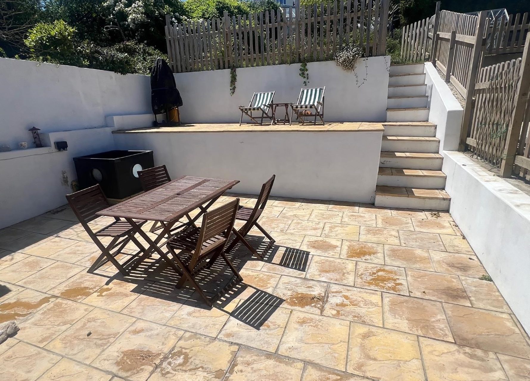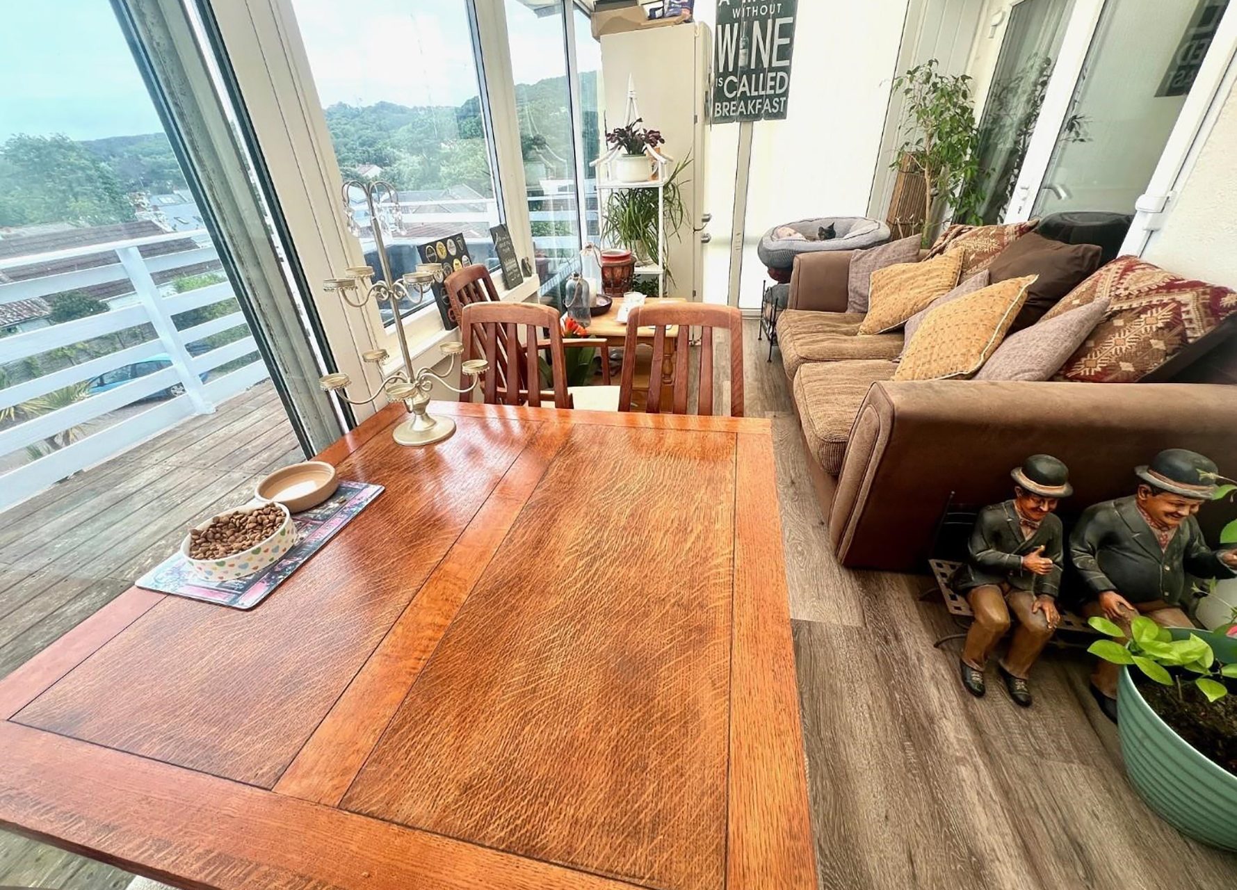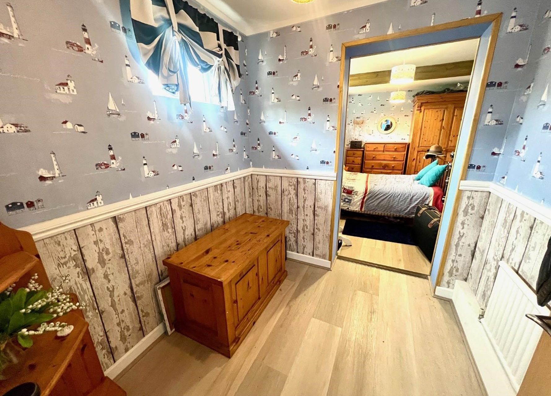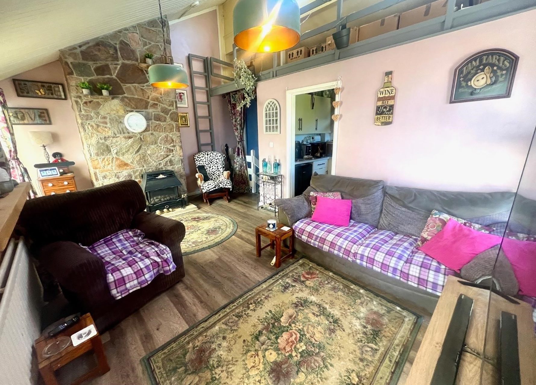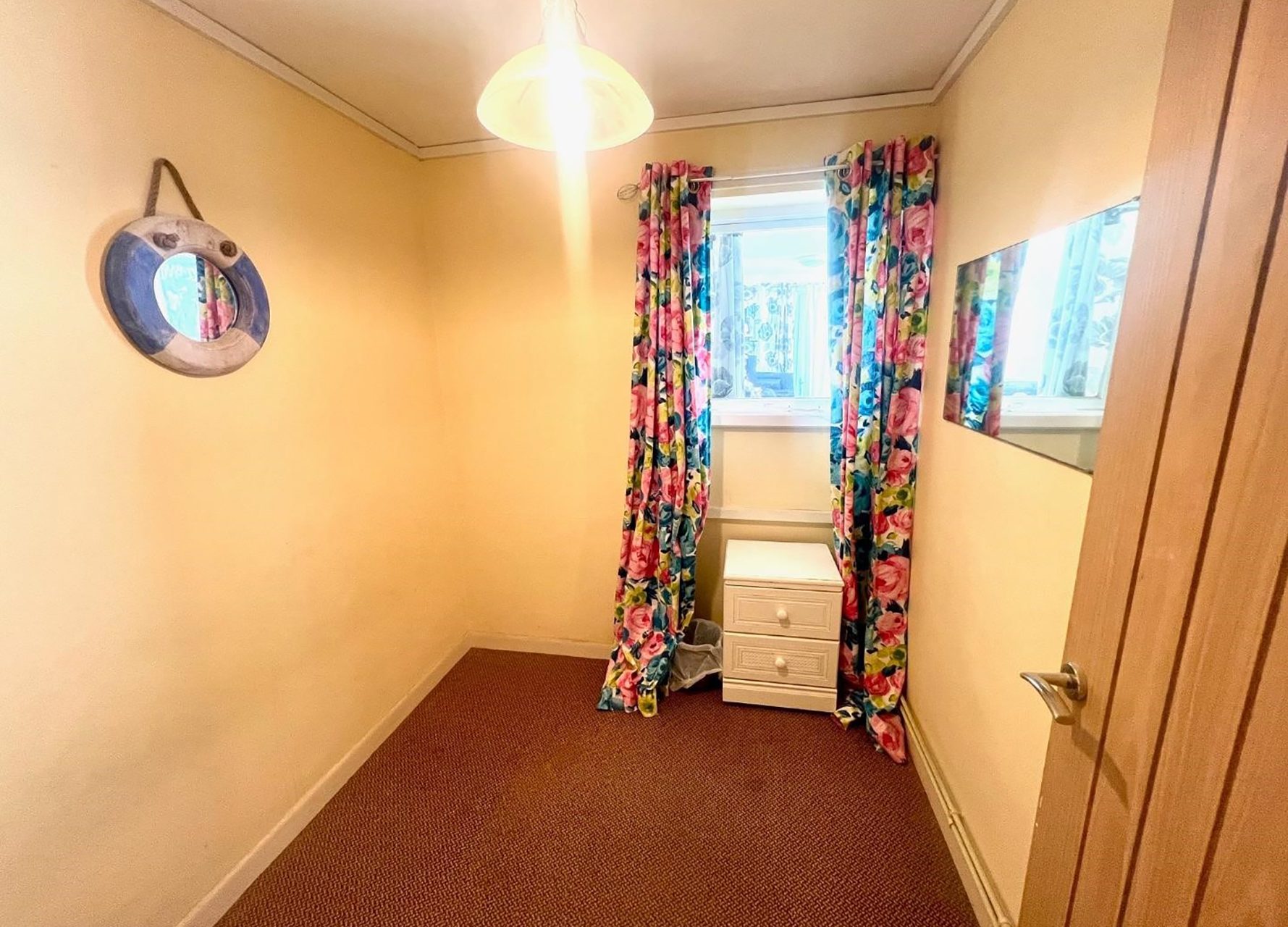 On the second floor, the master bedroom benefits from a modern shower en-suite. Just six steps up leads to a bright and spacious lounge featuring a striking granite fireplace, a fully fitted kitchen, and a conservatory/dining area that opens onto a balcony, perfectly positioned to enjoy the stunning sea views.