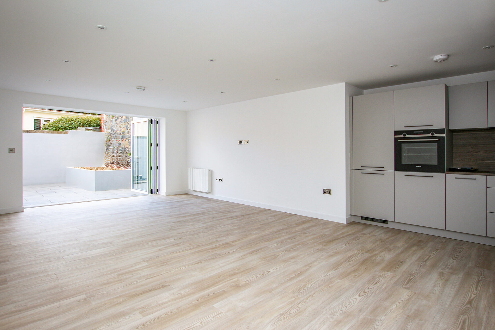 With its own front door and private garden, the property features open-plan living and modern, low-maintenance finishes throughout. The kitchen is fitted with Platinum Interiors cabinetry and premium Siemens appliances, while the bathroom benefits from underfloor heating for added comfort.