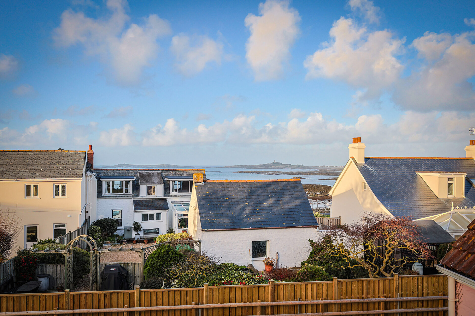 The accommodation includes four bedrooms, three bathrooms, with a well-appointed principal bedroom featuring an en suite shower room and views towards Lihou Island.