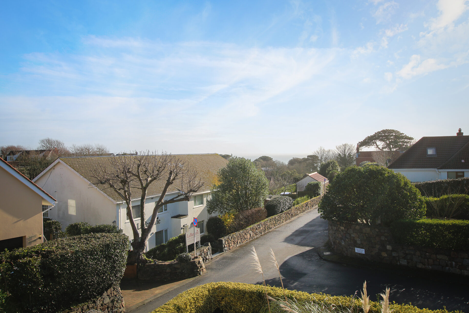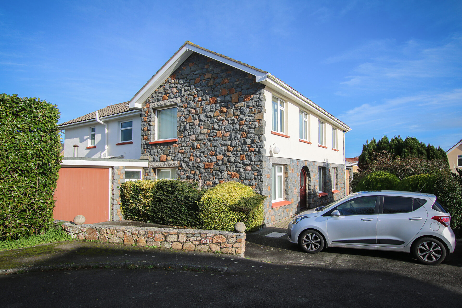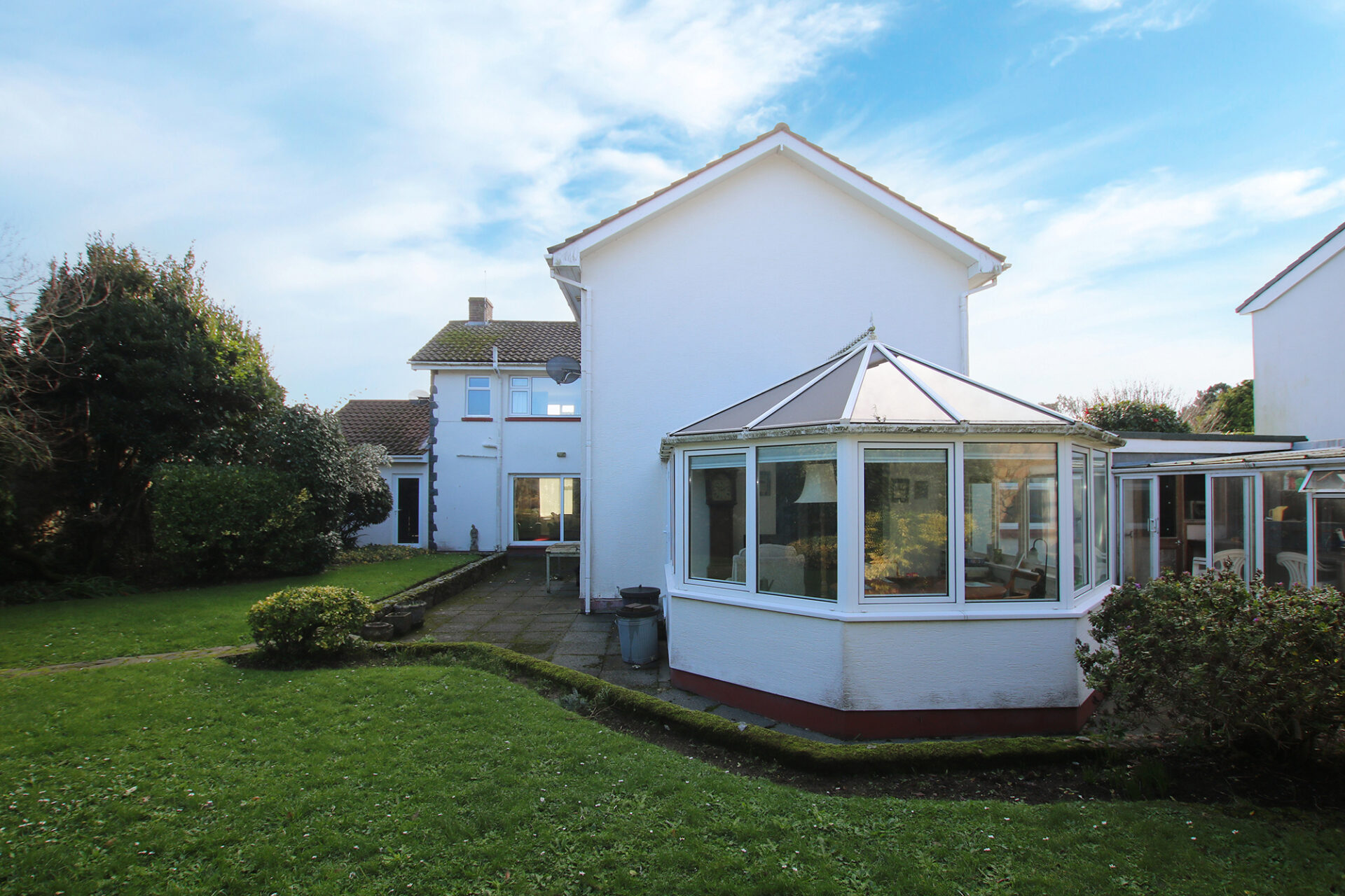 Prominently positioned on a quiet clos in the tranquil lanes of St Martin’s, this substantial detached home offers generous accommodation, complemented by distant sea views.