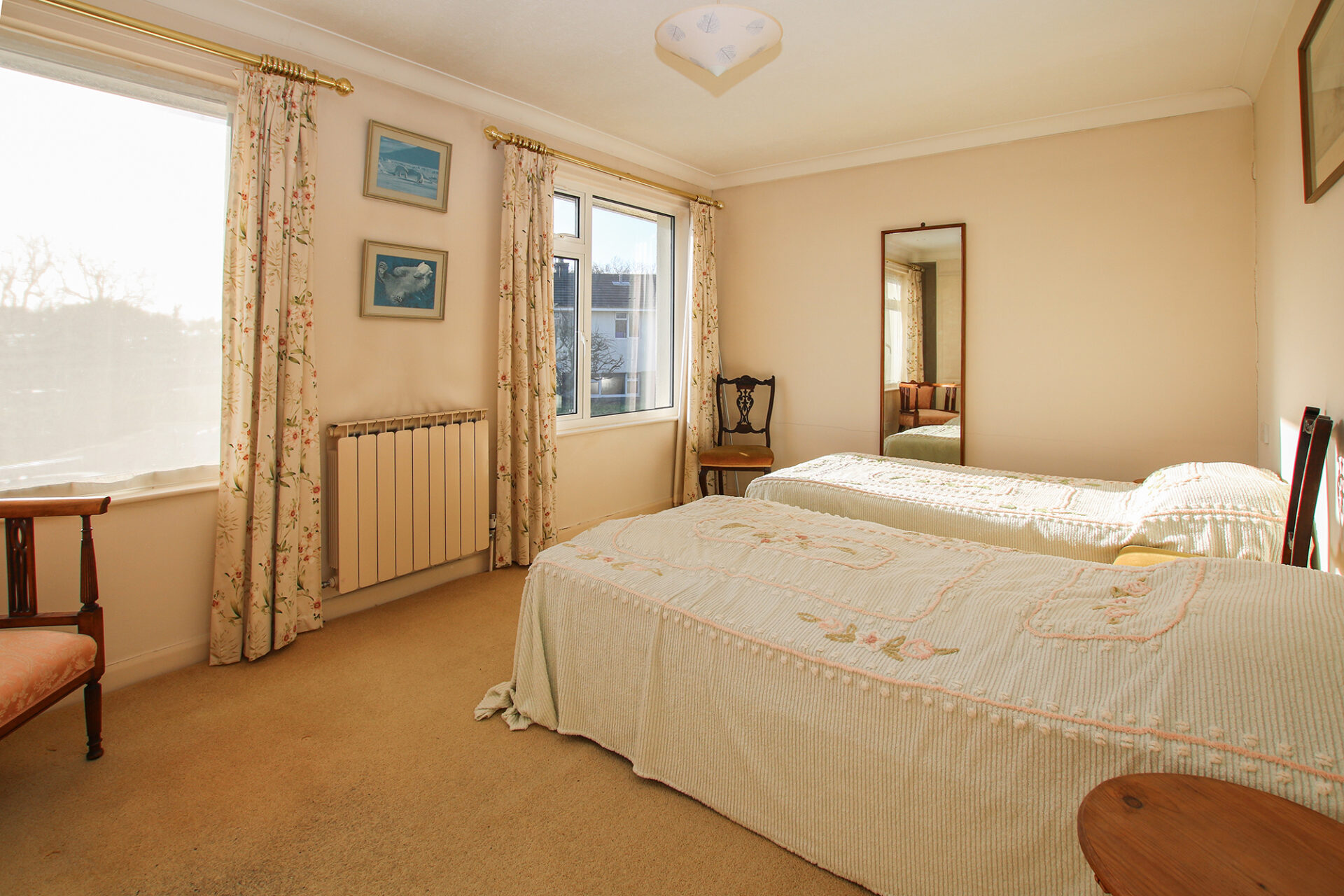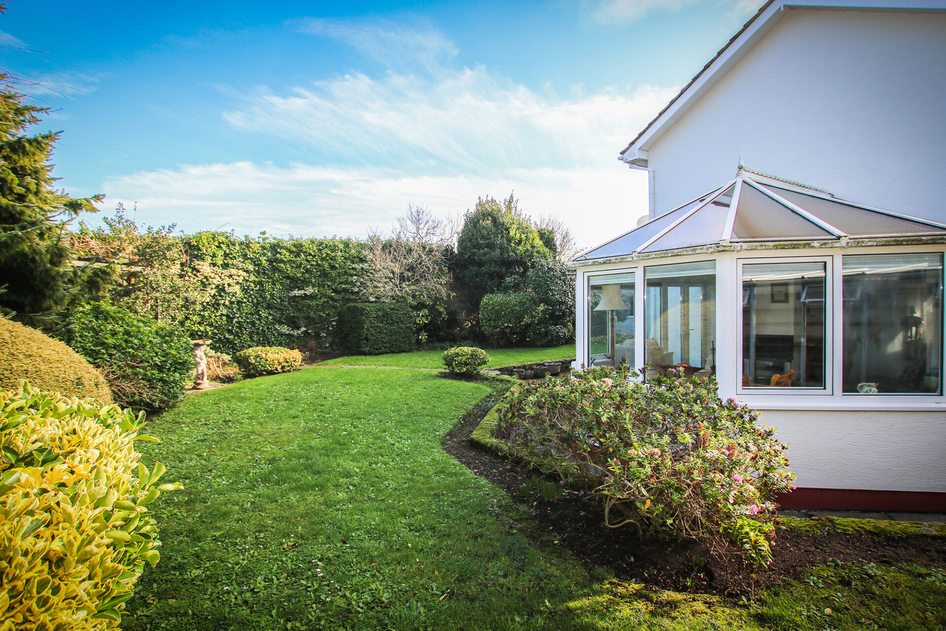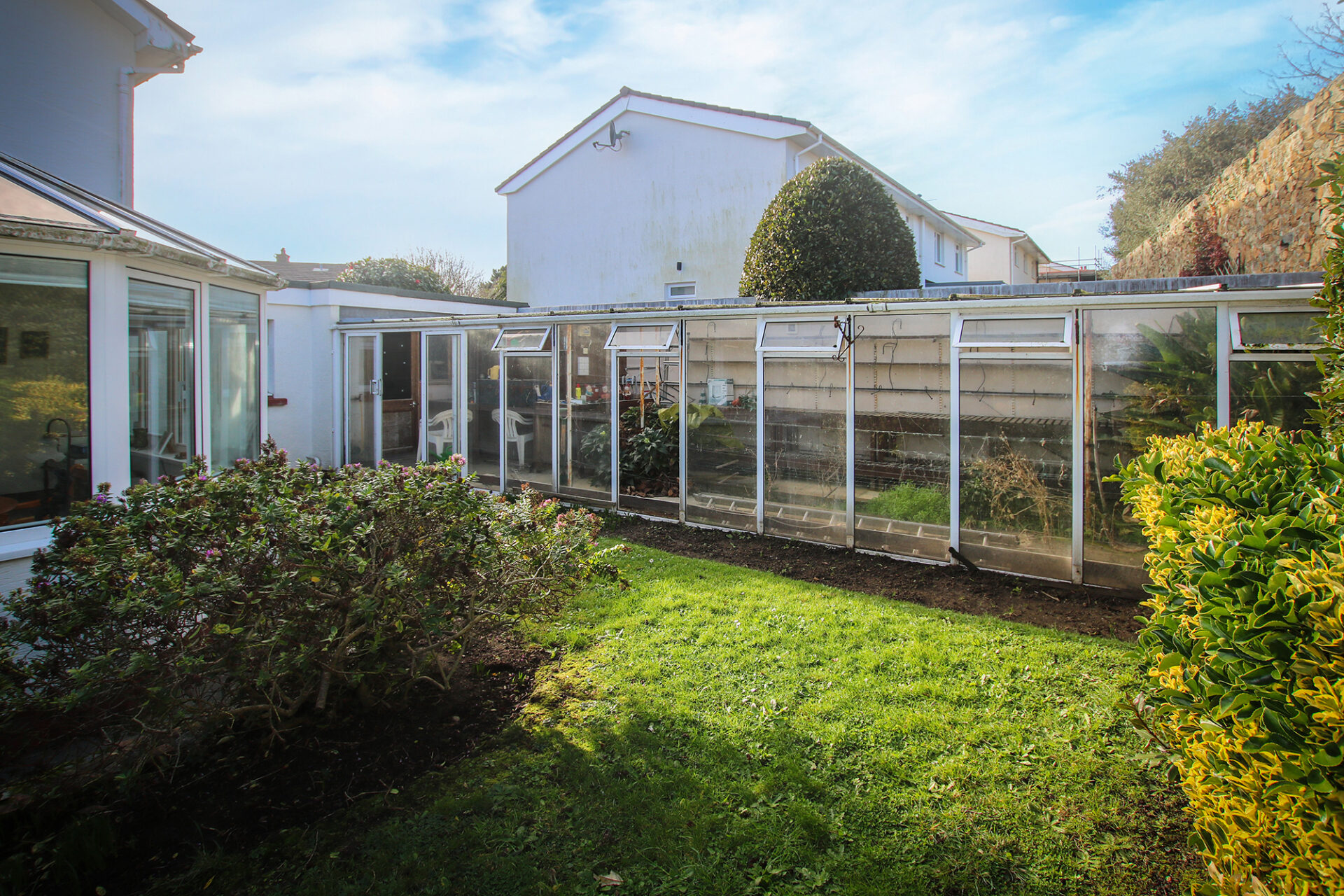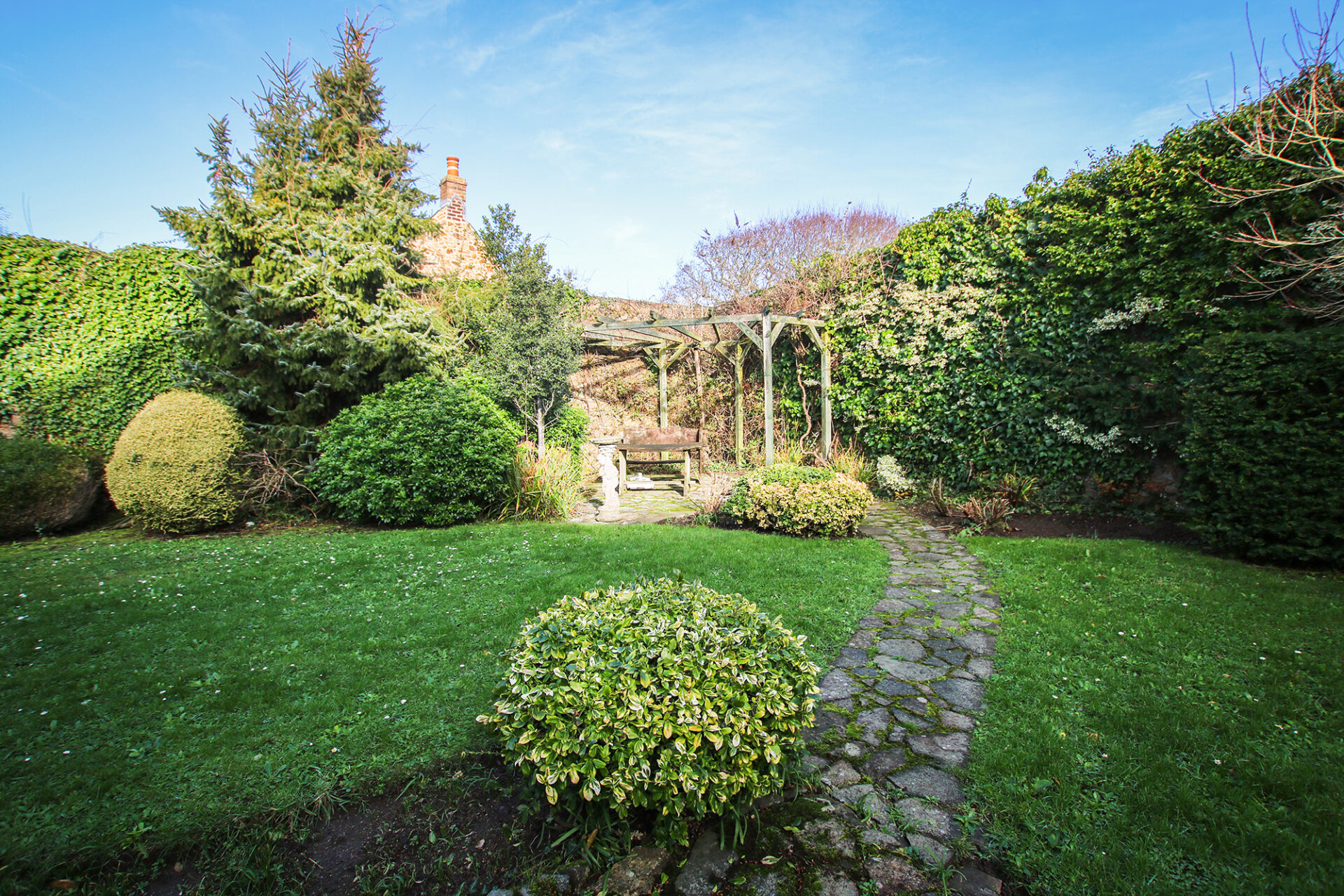 Prominently positioned on a quiet clos in the tranquil lanes of St Martin’s, this substantial detached home offers generous accommodation, complemented by distant sea views.