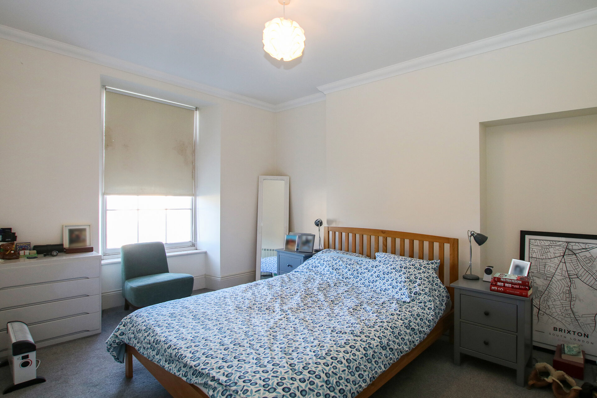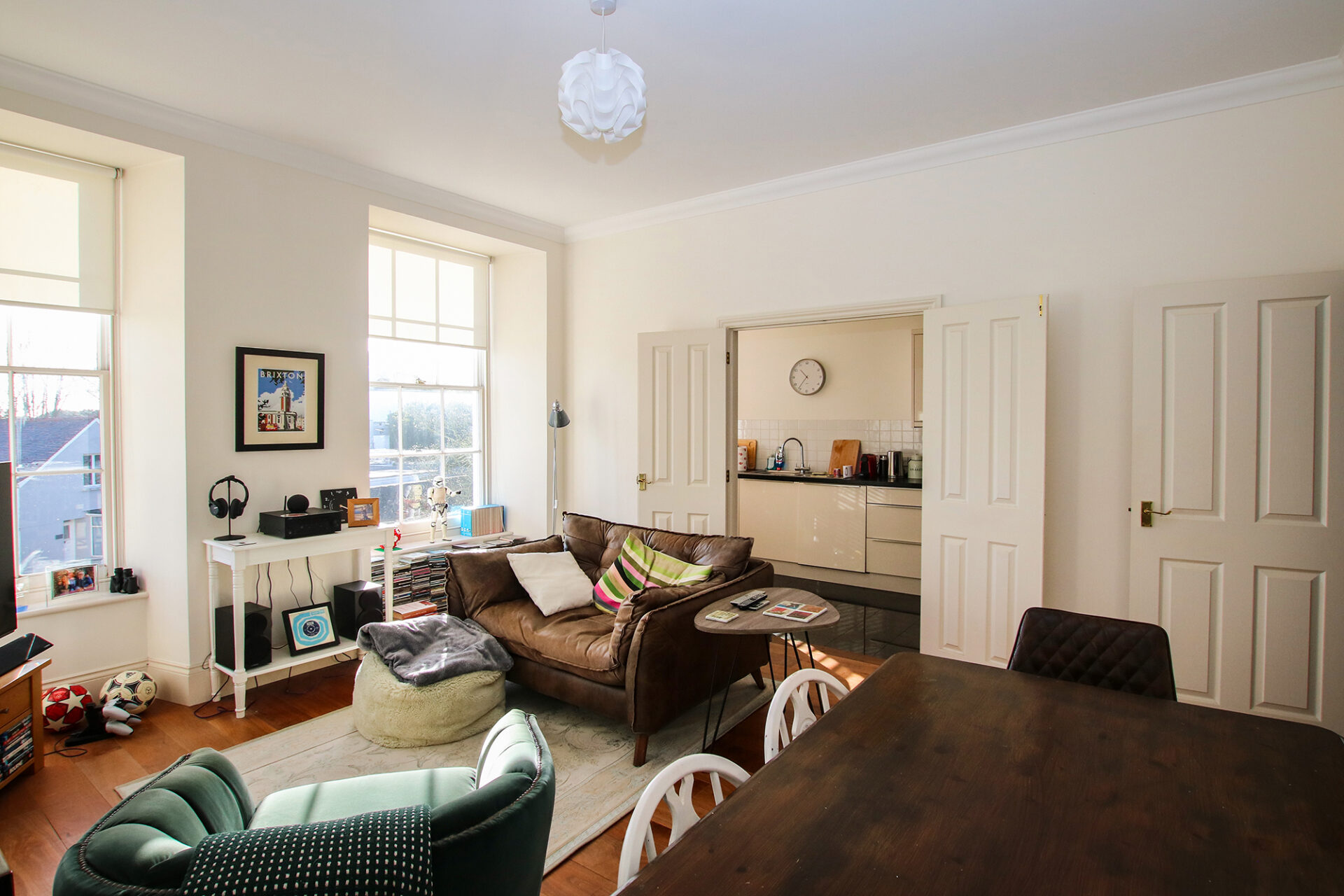 This two-bedroom, two-bathroom apartment has been finished to an exceptional standard and features impressive high ceilings, a separate utility room, two parking spaces, and access to communal gardens.