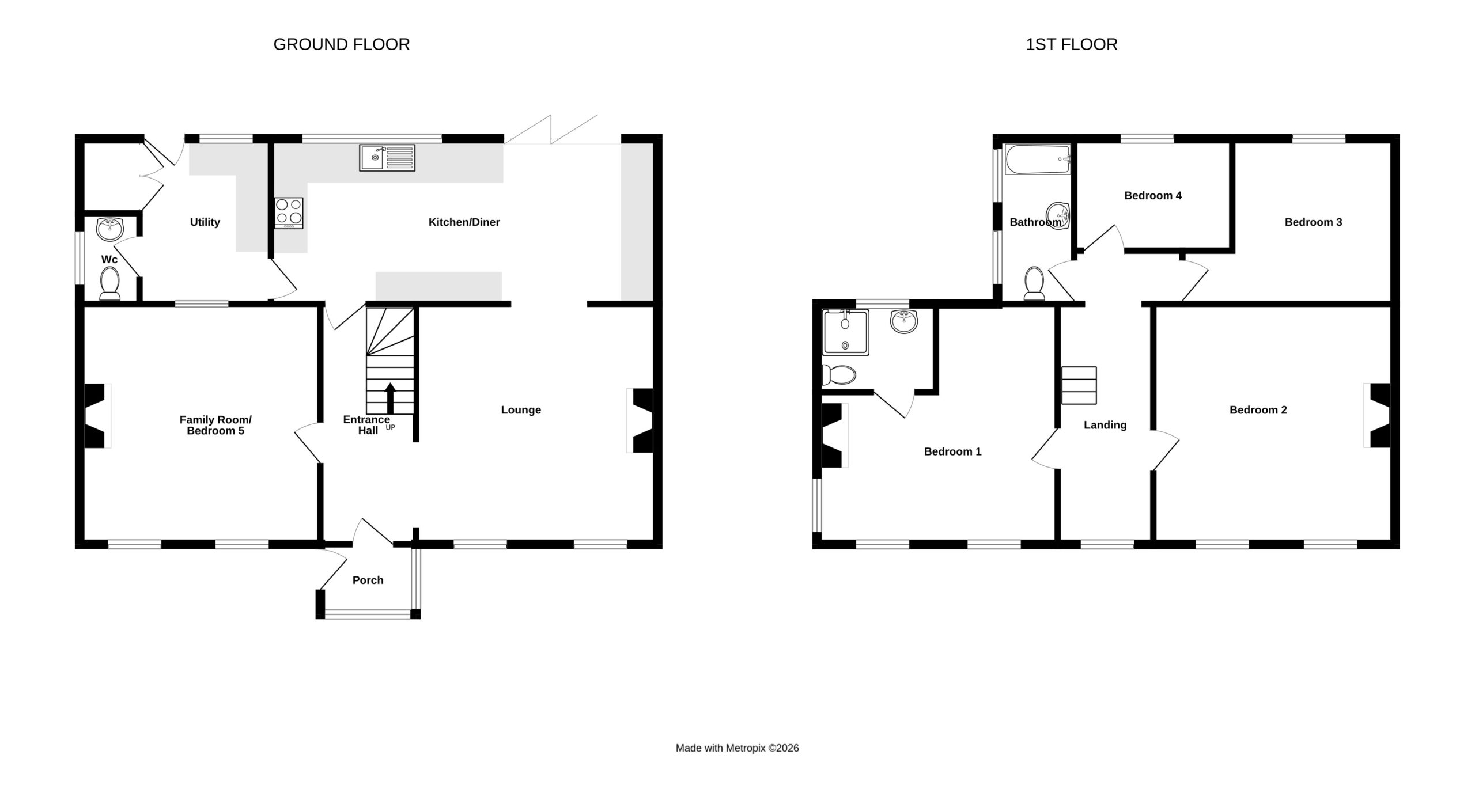 The property is well maintained throughout and offers flexible accommodation comprising up to five bedrooms, with the fifth bedroom easily adaptable as an additional ground floor reception room if required. The home is serviced by a family bathroom, an en-suite to the main bedroom and a separate WC. A generous kitchen-diner and a lounge complete the internal layout.