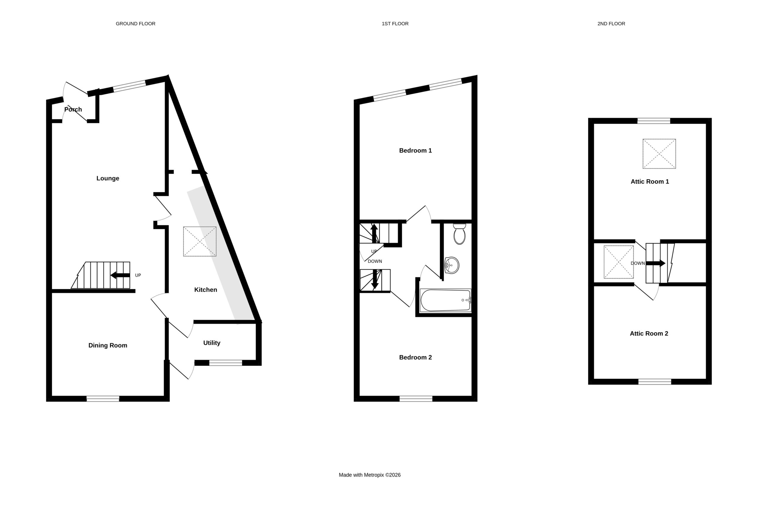 On the top floor are two good sized attic rooms. Externally there is parking for two vehicles and a mature split garden area hosting mature shrubs.