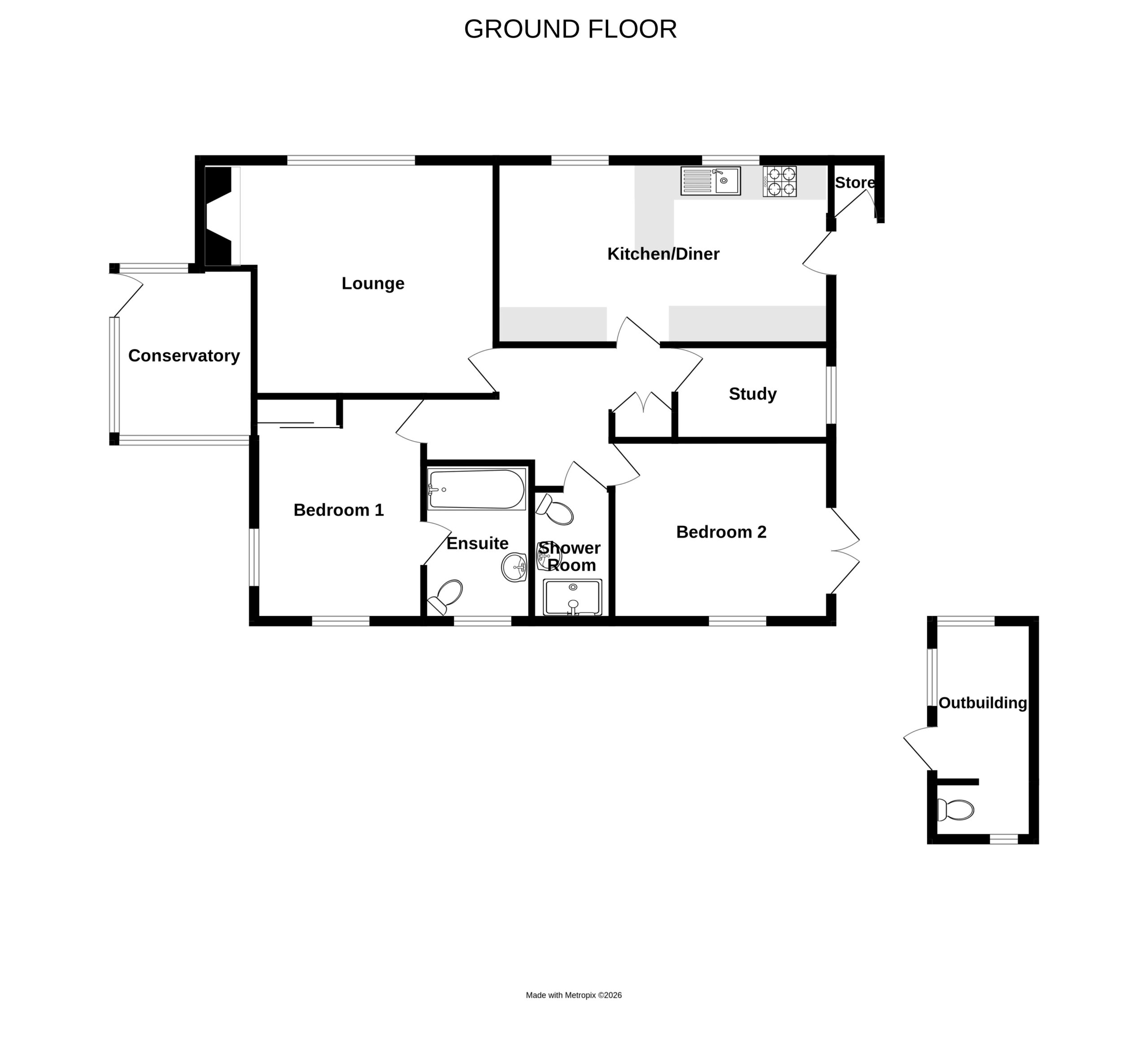 Offering a kitchen/diner, spacious lounge with working fireplace, conservatory, 2 bedrooms, one with ensuite bathroom, sperate shower room and study.