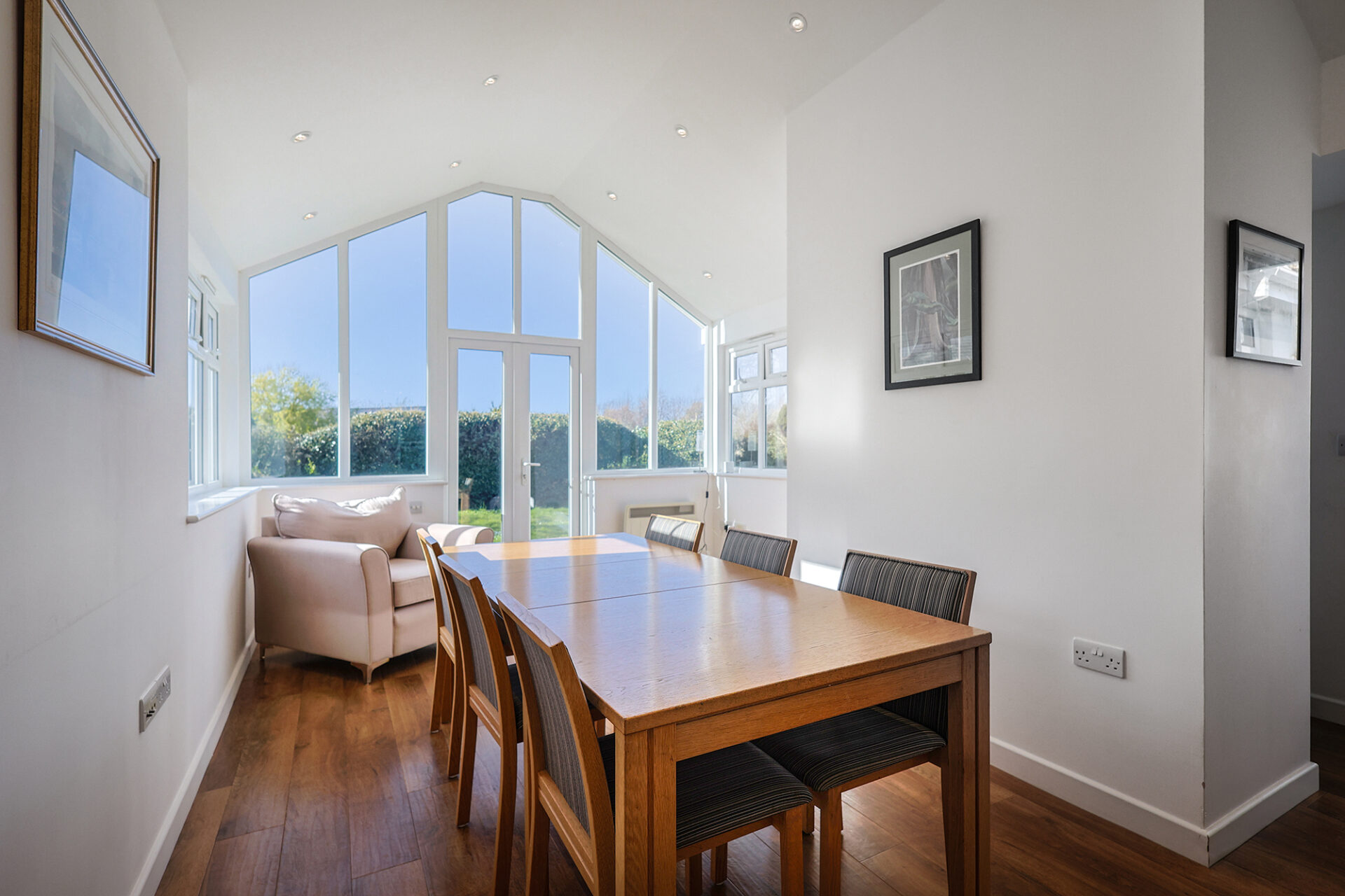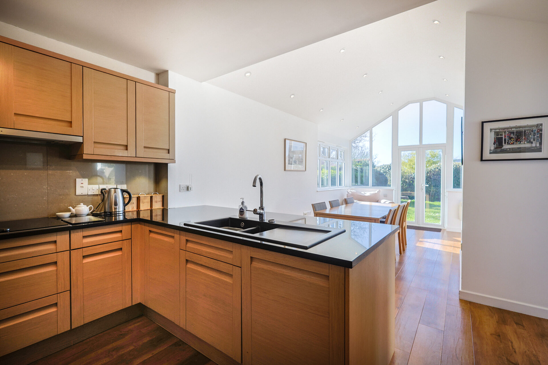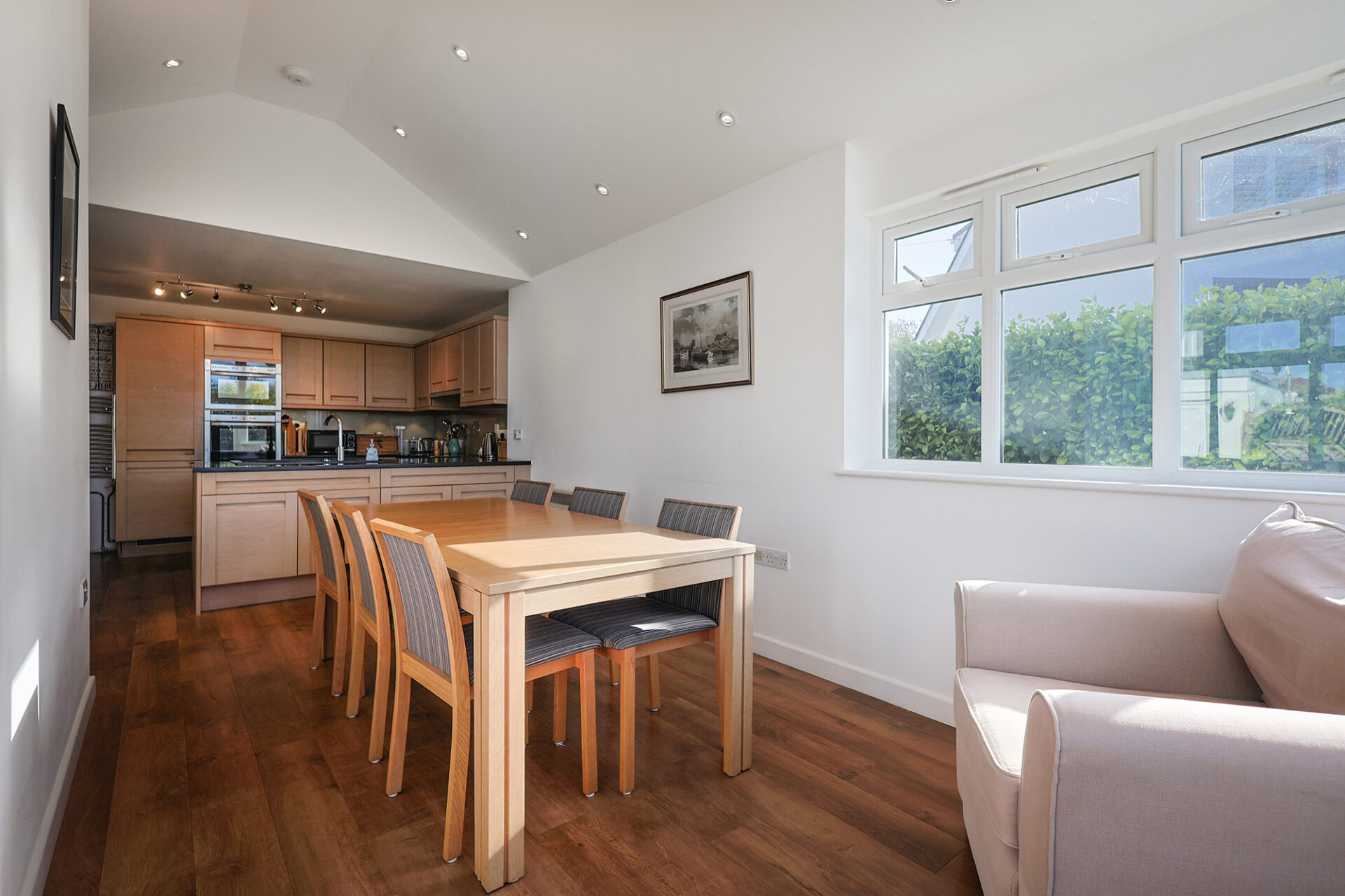 The rooms are bright and spacious and include a lovely kitchen open to a dining area with vaulted ceiling and access to the rear garden. A second dining area is located in the sitting room.